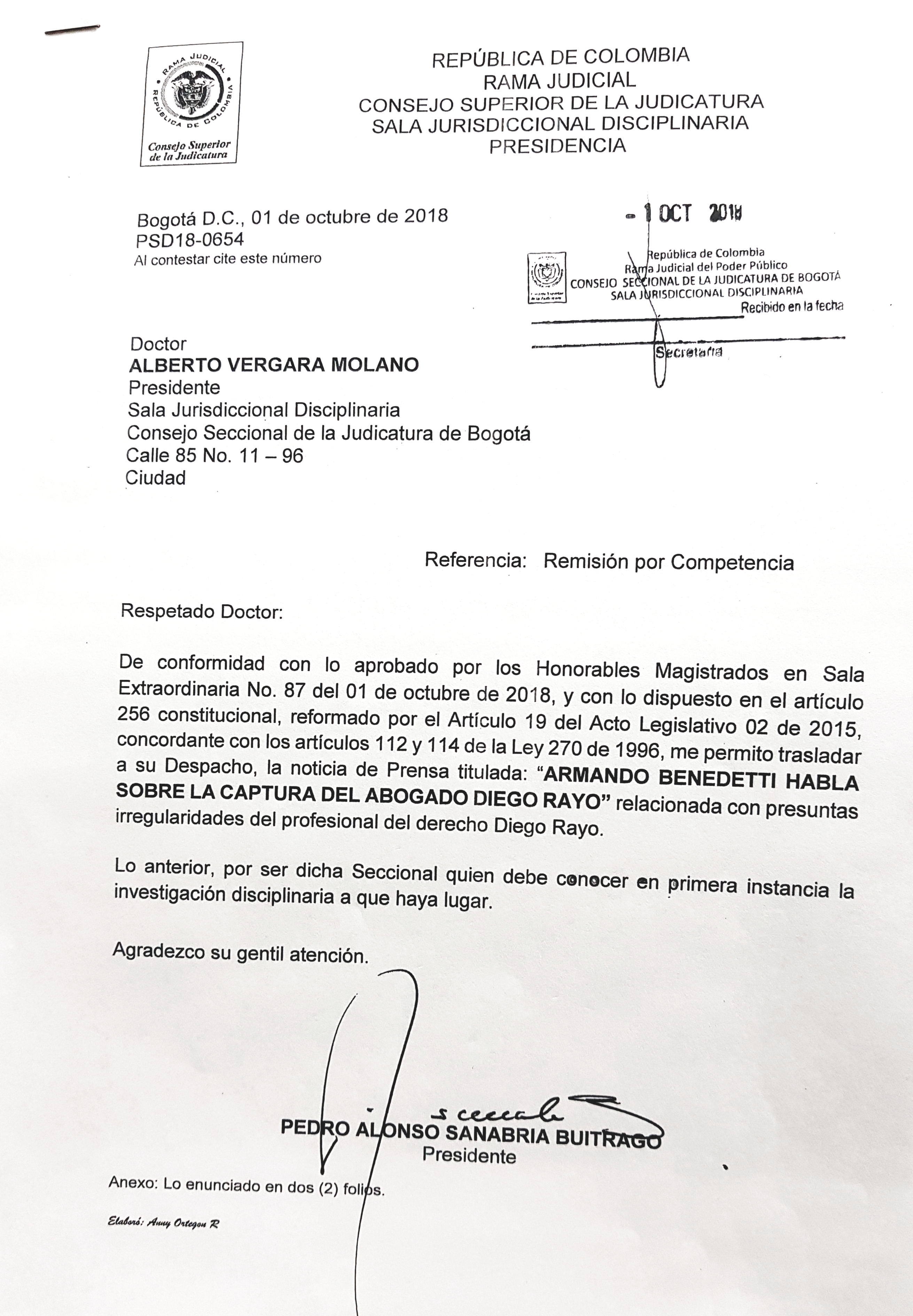 La Sala Jurisdiccional Disciplinaria solicitó al Consejo Seccional de la Judicatura de Bogotá, a través de un oficio, abrir investigación disciplinaria a que haya lugar al abogado DIEGO RAYO.