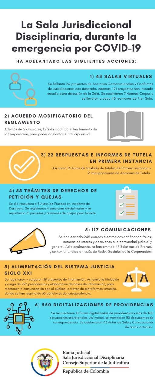 Por lo anterior la Sala Jurisdiccional Disciplinaria del Consejo Superior de la Judicatura ha venido acatando y cumpliendo sus funciones Constitucionales y legales durante esta contingencia nacional.